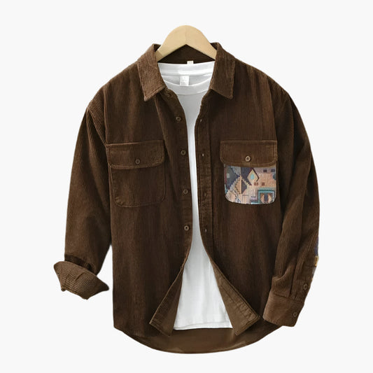Men's Vintage Casual Corduroy Button-Up Shirt with Patterned Pocket – Streetwear Overshirt