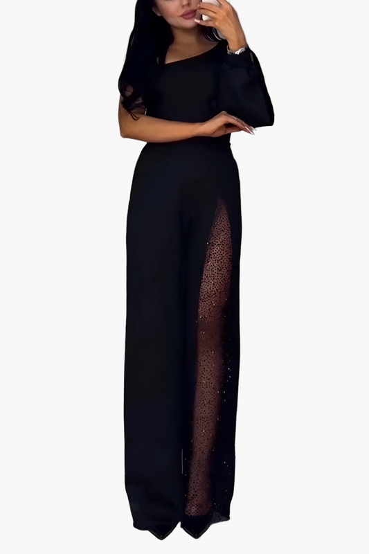 Women's One-Shoulder Wide Leg Jumpsuit with Sheer Panel – Elegant Party & Evening Wear