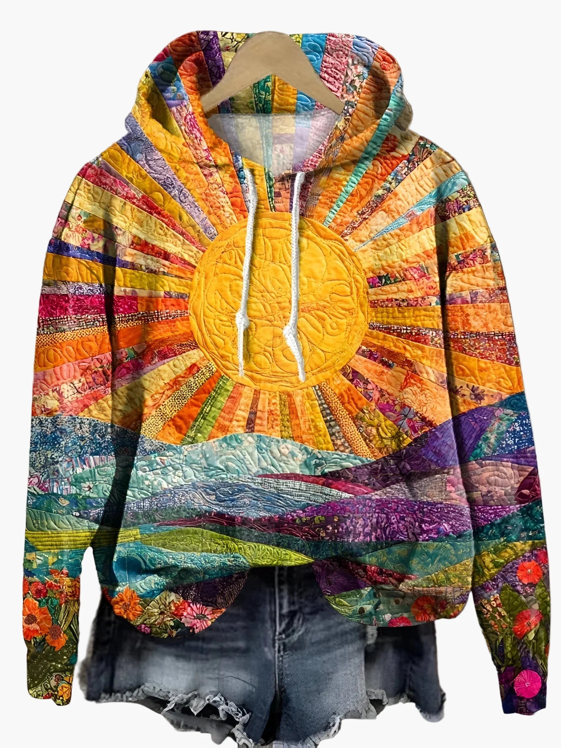 Bring the radiant energy of a beautiful sunrise wherever you go! This women's hoodie features an artistic and vibrant design with a bold sunburst pattern that spreads positivity and joy with every wear. The lively patchwork-style print combines a spectrum of bright colors, making it an eye-catching addition to your casual wardrobe.
