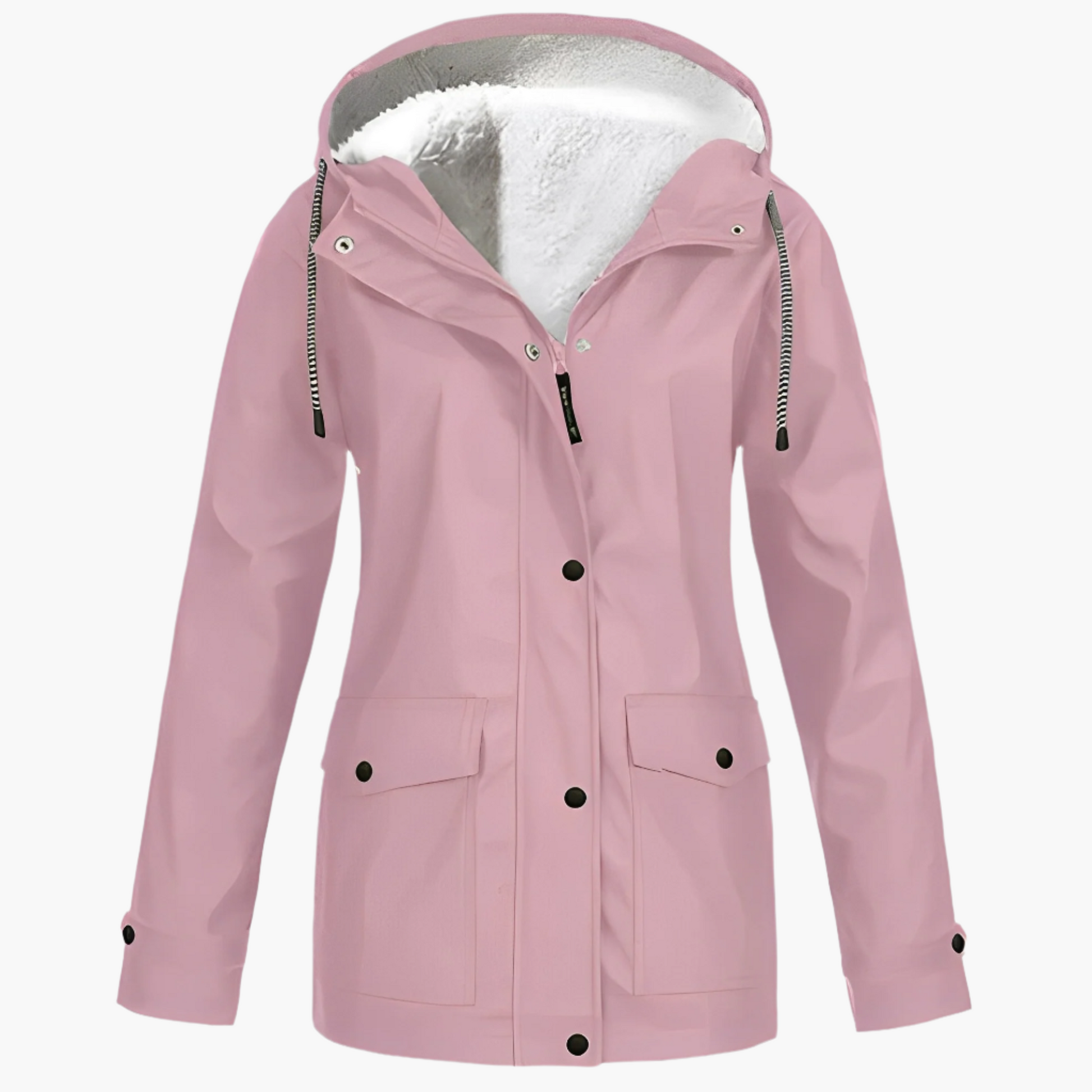 Stay warm and dry all season with this Women's Winter Fleece Lined Hooded Rain Jacket, designed for both style and practicality. The plush fleece lining delivers exceptional warmth and comfort, making it perfect for chilly, rainy, or windy days. Its adjustable hood and snap-button front offer extra protection against the elements, while the modern fit and clean design ensure you look great wherever you go.